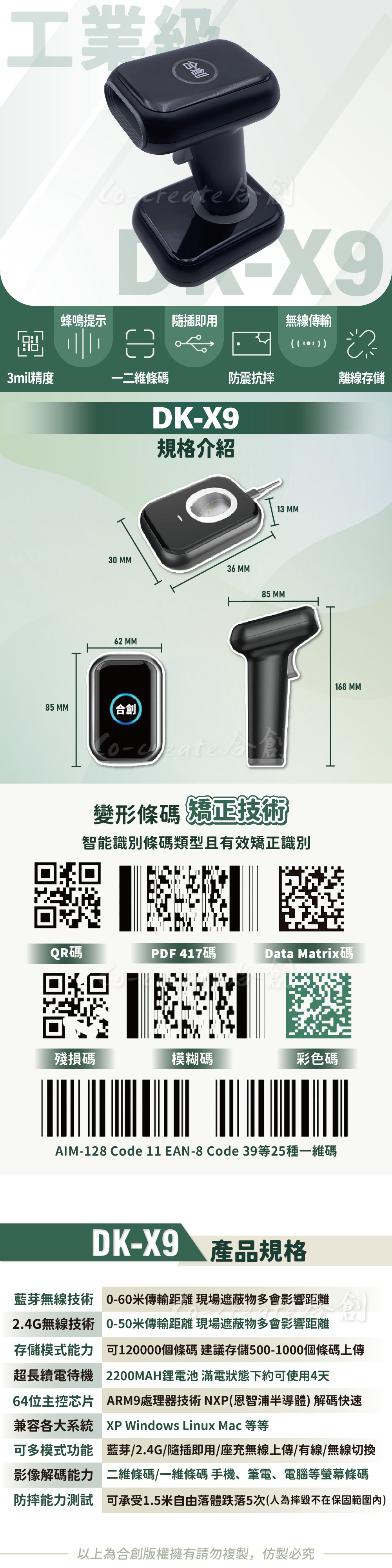 【型號: DK-X9座充款 藍芽/2.4G雙模式/有線/無線/一維/二維 工業級急速版解碼】