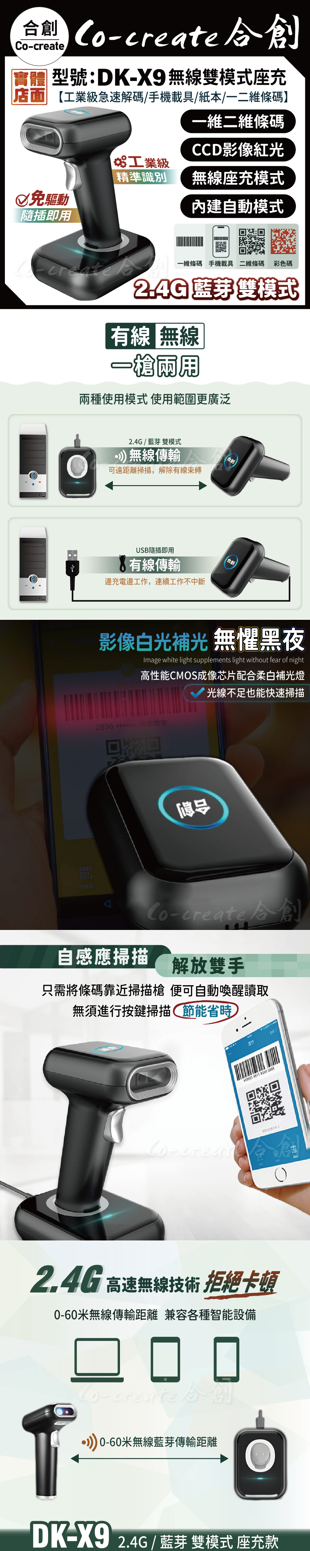 DK-X9:2.4G藍芽無線雙模式,座充隨插即用,掛上就可充電,可掃一二維以及螢幕條碼(有線/無線兩用)