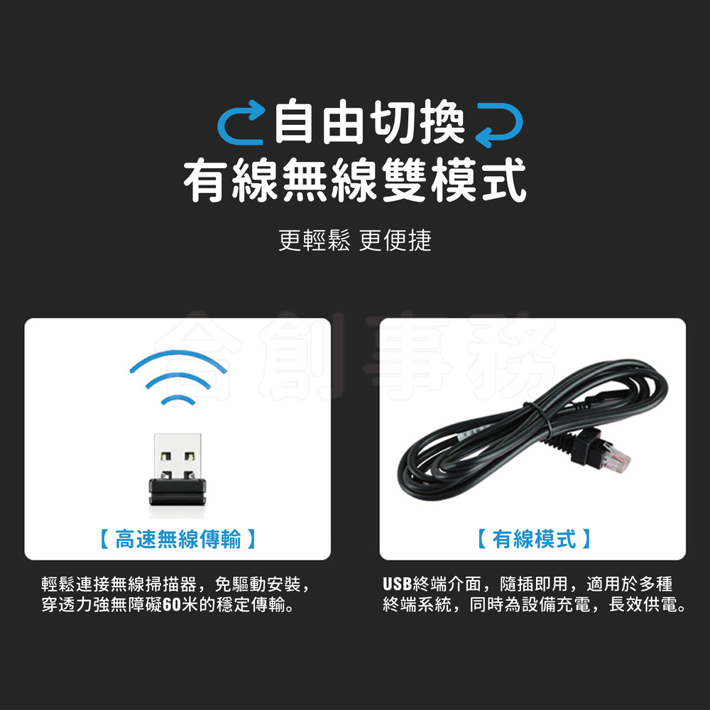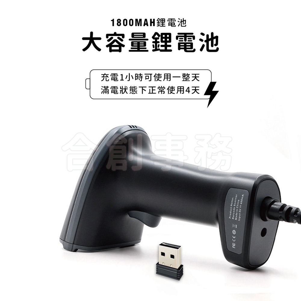 2.4G藍芽無線雙模式,接收器隨插即用,USB線充電,可掃一二維以及螢幕條碼(有線/無線兩用)