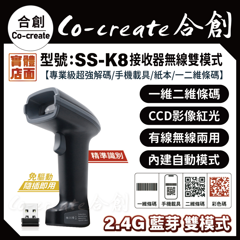 【型號: SS-K8接收器款 藍芽/2.4G雙模式/有線/無線/一維/二維專業版解碼】