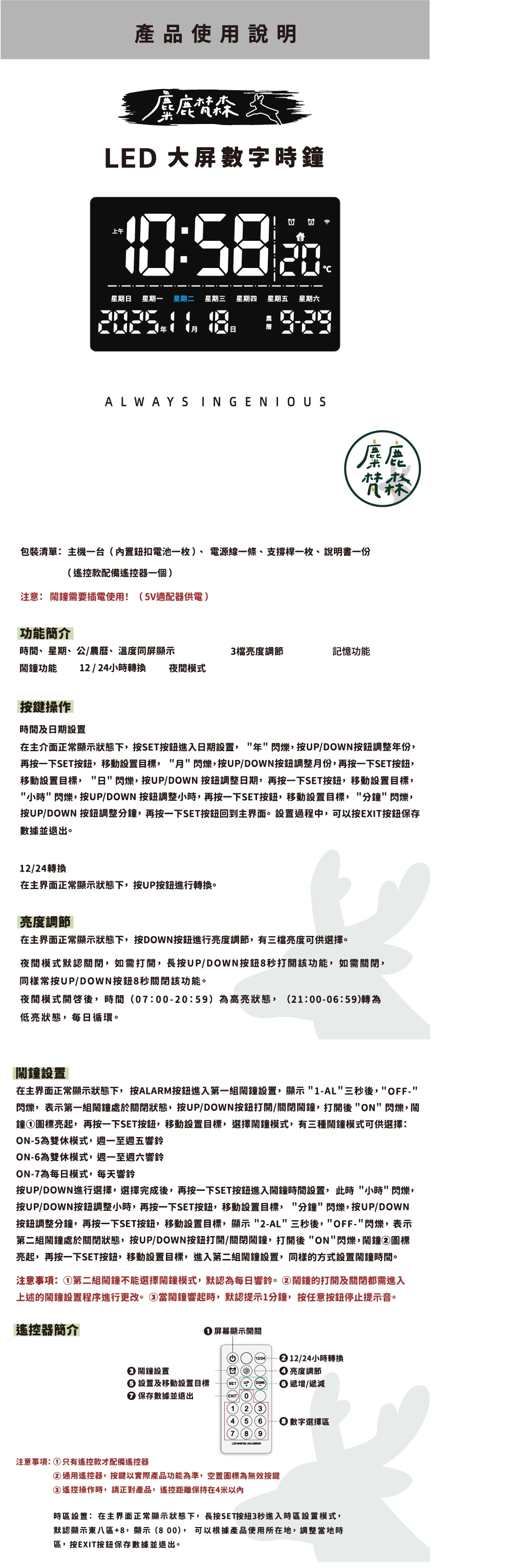 ◼️紅外線遙控 ◼️大屏幕電子鐘 ◼️溫度顯示 ◼️農曆顯示 ◼️高顯清晰 ◼️三段調光
